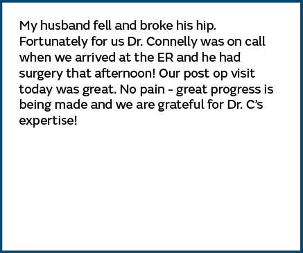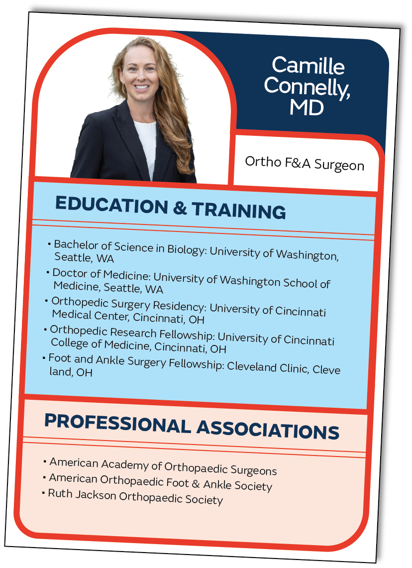 Dr. Connelly has extensive training in surgical and nonsurgical foot and ankle treatments, including fracture care, ligament and tendon reconstruction, ankle replacement and fusion, ankle arthroscopy, bunion correction, and flatfoot reconstruction. Dr. Connelly also performs partial and total knee replacements, including robotic assisted surgery. Her approach to patient care is focused on accurate diagnosis and educating her patients about their conditions and injuries so they can play an active role in the decision-making process and treatment plan. Dr. Connelly’s goal is to reduce pain and increase function to get patients back on their feet so they can return to the activities they love.