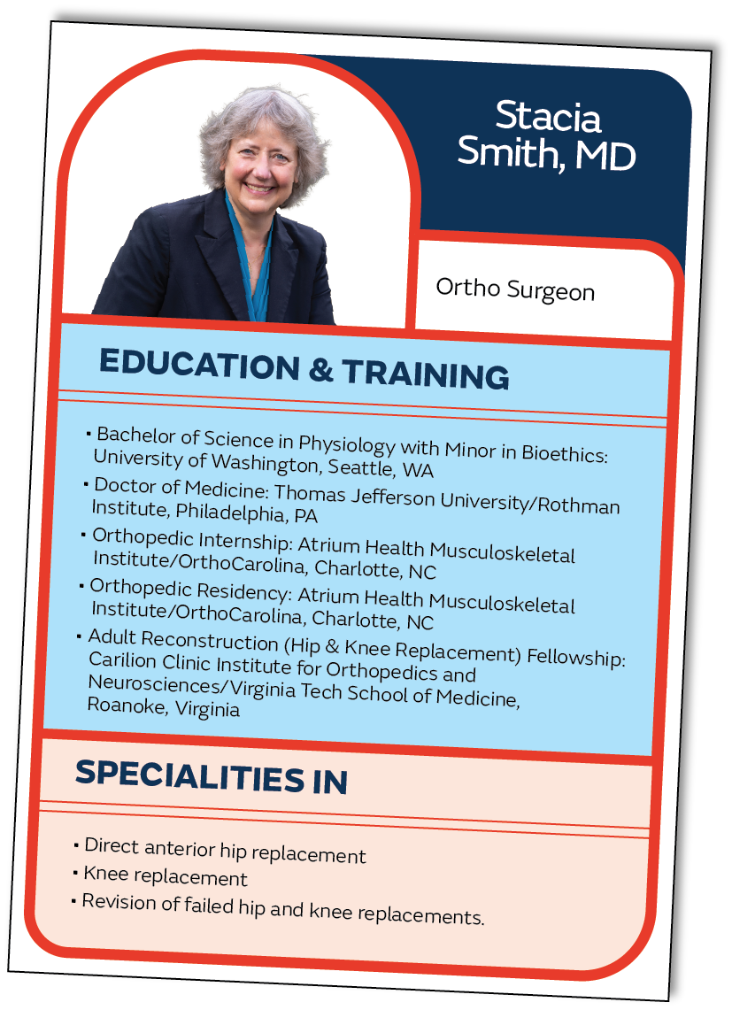 Dr. Stacia Smith is a board-certified orthopedic surgeon specializing in surgery of the hip, knee, and upper extremity. Her surgical expertise includes joint replacement of the hip and knee, knee arthroscopy, carpal tunnel release, trigger digit release, and shoulder arthroscopy. She has recently gained expertise in robotic assisted unicompartment knee replacement and is excited to optimize every patient’s surgical results. Her goal is to provide individualized treatments to make her patients as functional as possible and help them be active, athletic, and able to participate in life, work, and sports.